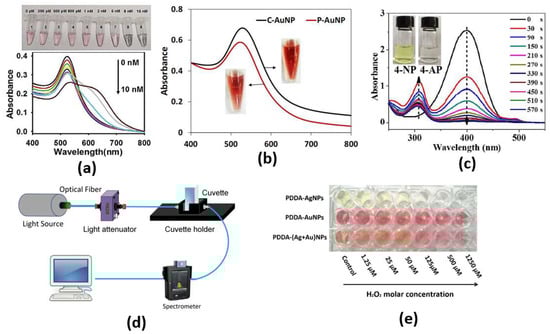 (a) Photographs of color change and typical UV–vis spectra upon addition of different concentrations of miR-21 [30], (b) UV−Vis absorption spectra of C-AuNPs and P-AuNPs. Inset: colors of AuNPs solution [27], (c) UV-vis absorption spectra of the reduction in 4-NP by NaBH4 in the presence of Au/Bi2Se3 nanosheets, with inserted photograph showing the color change of reduction in 4-NP [26], (d) The optical-fiber-based LSPR [29], (e) Evolution of colorimetric changes of PDDA-AgNPs, PDDA-AuNPs and PDDA-(Ag+Au)NPs [31].