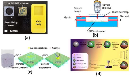 (a) Au/HCP-PS monolayer SERS biosensor chip [44], (b) Experimental setup for continuous SERS measurements in the gas phase [46], (c) Schematic illustration of the liquid phase detection using SLIPSERS [49] and (d) SERS sensor for the selective detection of histamine [51].