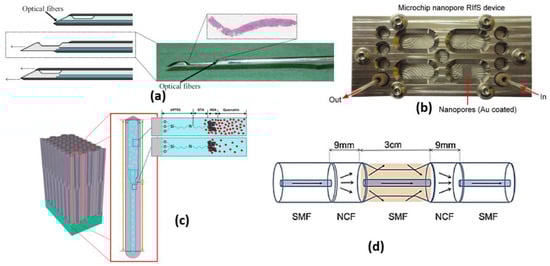 (a) Biopsy needle with integrated optical fibers [55], (b) Microfluidic nanoporous RIfS device [57], (c) Schematic illustration of binding event between human serum albumin (HSA) and quercetin in the environment of fresh primer binding sites (PBS) [60] and (d) The structural diagram of the sensing part. [61].