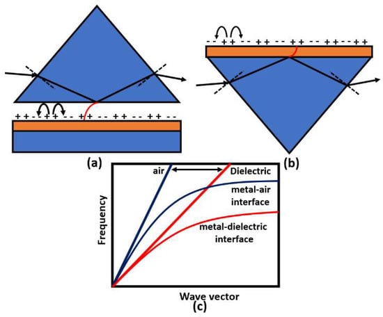 Prism coupling to SPPs based on evanescent wave through total internal reflection using (a) Otto and (b) Kretschmann configurations. The possible light paths for excitation in the prism coupling and SPP dispersion curve are shown in (c).