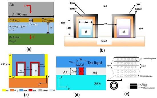 Cross-section of the (a) Hybrid plasmonic refractive index sensor with the nano slit array [100], (b) Vertical slot waveguide biosensor [96], (c) DNA HPSW biosensor [106], (d) DSHP waveguide covered with test liquid [110] and (e) Compact parallel biosensor [112].