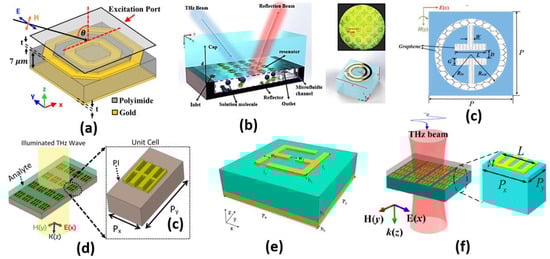 Schematic structures for the (a) Hexagonal cancer biosensor [120], (b) Microfluidic sensor [125], (c) Graphene metamaterial absorber [127], (d) Double corrugated metamaterial biosensor [128], (e) Unit cell of the F-shaped metamaterial sensor [129] and (f) Spoof surface plasmon metamaterials (MMs) structure [131].