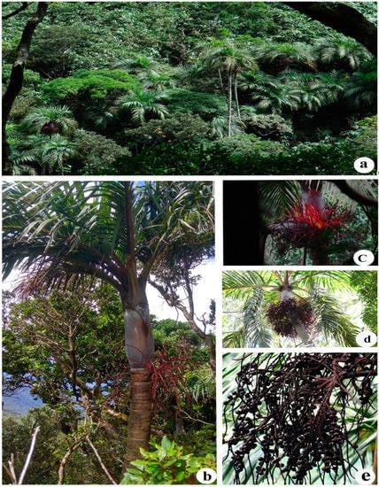 - Dransfield, J.; Uhl, N.W.; Asmussen, C.B.; Baker, W.J.; Harley, M.M.; Lewis, C.E. Genera palmarum: The Evolution and Classification of Palms; Royal Botanic Gardens, Kew: London, UK, 2008. [Google Scholar]