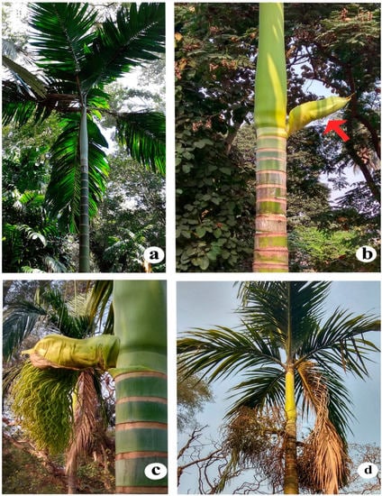 Bentinckia nicobarica (a) habit, (b) spathe, (c) inflorescence, and (d) infructescence.