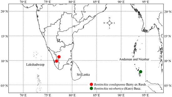 Bentinckia Berry ex Roxb. is a small genus characterised by its distinct crownshafts and much-branched inflorescence with rachillae bearing flowers in laterally compressed pits []. It is endemic to India and comprises only two species, viz. B. condapanna (Figure 1) and B. nicobarica (Figure 2) [] and shows disjunct distribution []. Bentinckia condapanna is only found on mountain cliffs of the southernmost Western Ghats at 1200–1900 m in the forests of Kerala and Tamil Nadu. It is a strong light demander, fog resilient, fire and drought loving, and a good colonizer. It is a very sensitive species in its regeneration process and prefers to grow in open places. The species occur well in shallow, porous soil with good drainage in first or second order streams where a continuous soil moisture regime is ensured frequent precipitation []. This species is medicinally important and used in the Siddha system of medicine []. Its terminal buds and young leaves are edible. It is cultivated as an ornamental palm in botanical gardens and parks due to its slender stem and feather-like leaves []. Bentinckia nicobarica grows at low altitudes in the humid forests of the Kamorta, Katchal, Great Nicobar, Nancowry, and Trinket Islands [,]. It has a small number of populations in the Nicobar group of islands and is at risk of extinction [].