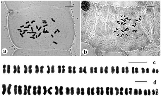 Mitotic metaphase chromosomes and karyograms. (a) and (c) show Bentinckia condapanna (2n = 30); (b) and (d) show B. nicobarica (2n = 32). Scale bars = 5 μm.