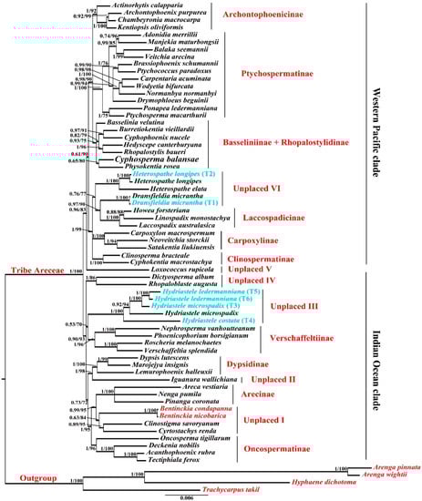 The palm family is considered among the oldest and most well-studied families. Arecoideae and Areceae are the largest subfamily and tribe from Arecaceae, respectively. Many studies have reported phylogenetic analysis of Areceae; however, the relationship within the tribe is still ambiguous. Several reports strongly support the monophyly of Areceae [,,,,] while others recover it with less support [,,,]. In addition, a few other studies also reported the phylogenetic relationship of Areceae [,,,], but all of them were unable to report a well-resolved molecular phylogeny of Areceae. Many authors reported phylogeny based on single plastid or nuclear DNA (PRK and RPB2) regions. However, the role of low-copy nuclear and chloroplast DNA becomes very important while studying the phylogeny of palm. Therefore, the right combination of molecular markers is inevitable for a well-resolved phylogeny []. Areceae contains 11 subtribes, 61 genera (10 unplaced), and 660 species, even though the phylogenetic positions of several genera are not well understood. Here, we are reporting a well-resolved phylogeny of Areceae built using the appropriate combination of chloroplast and nuclear regions. Based on this phylogeny, it is clear that Areceae is divided into two main groups: the Western Pacific clade and the Indian Ocean clade. The Indian Ocean clade consists of four subtribes: Oncospermatinae, Arecinae, Dypsidinae, and Verschaffeltiinae while the Western Pacific clade consists of seven subtribes: Archontophoenicinae, Ptychospermatinae, Basseliniinae, Rhopalostylidinae, Laccospadicinae, Clinospermatinae, and Carpoxylinae. Based on PRK and RPB2, Norup et al. [] found that the Western Pacific and Indian Ocean clades are monophyletic. Nevertheless, the interrelationship within the members of the subtribes remained unresolved on account of polytomy.