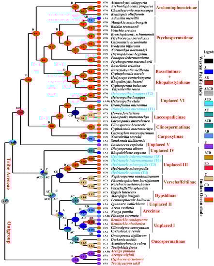 Biogeographic areas were defined considering the earlier biogeographic studies and distribution of all Areceae species [,]. The distribution range of Areceae was coded as follows: (A) Eurasia up to Wallace’s Line and the Andaman and Nicobar Islands, (B) India and Sri Lanka, (C) Indian Ocean Islands and Madagascar, and (D) the Pacific (areas east of Wallace’s Line and Australia). The S-DIVA analysis was performed on an all-compatible Bayesian tree in RASP v 4.2 []. To obtain trustworthy results of biogeographic analysis, 1332 binary trees were used to run S-DIVA.