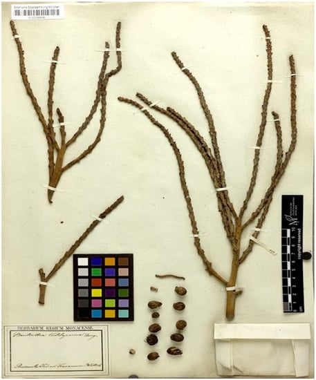 - Mane, R.N.; Lekhak, M.M. Lectotypification of Corypha taliera Roxburgh and Orania nicobarica Kurz (Arecaceae). Phytotaxa 2021, 489, 236–239. [Google Scholar] [CrossRef]