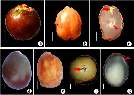 Fruits and seeds in Bentinckia species. B. condapanna (a) fruit, (b) seed, and (c) cross section of seed. Arrow shows apical embryo and arrowhead horny albumen. Scale bars = 0.2 cm. B. nicobarica (d) fruit (e) seeds, and (f,g) cross section of seed. Arrow shows ribbed albumen and arrowhead apical embryo. Scale bars = 0.2 cm.