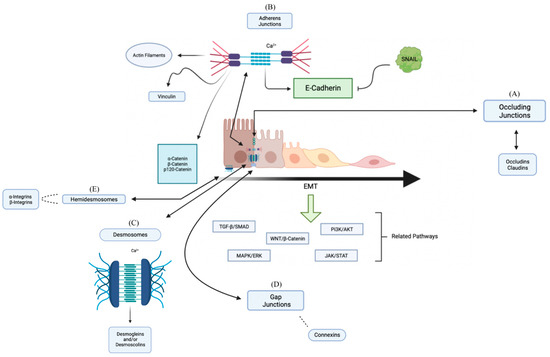 The descriptive diagram model of composition and interactions between proteins that are part of the cell union complex. (A) The Occlusion Junctions seal the spaces between epithelial cells, and it is of paramount importance in sealing the epithelial tissues to water molecules and ions, making the passive diffusion of ions impossible; here Occludins and Claudins act. (B) The Adherens Junctions connect the bundles of Actin Filaments of one cell with the bundles of another cell where the primary function is to promote adhesion between neighboring cells being crucial in tissue architecture; here Cadherins, α-Catenins, β-Catenins, p120-Catenin, and Vinculins acts. The regulation of the cell–cell adhesion complex is mediated by E-Cadherin and can favor the transformation of epithelial cells into mesenchymal cells after triggering EMT inducers in the various pathways involved; among those involved, the SNAIL protein helps to promote this process by blocking the E-Cadherin. (C) Desmosomes connect the Intermediate Filaments of one cell with those of the other cell, with the main aim of promoting intercellular adhesion, not interfering with other junctions; here Desmogleins, Desmocolins, Plakoglobin, Desmoplakin, and the Intermediate Filaments are involved. (D) The Gap Junctions allow the passage of water-soluble molecules from one cell to another; it is formed by six subunits of Connexins forming a hexagonal complex. (E) Hemidesmosomes anchor the cell’s Intermediate Filaments to the Extracellular Matrix—Cell/Matrix adhesion anchors the Actin Filaments of the cell to the Extracellular Matrix, connecting the Intermediate Filaments of the Cytoskeleton with the Extracellular Matrix; here α-Integrins and β-Integrins are involved.