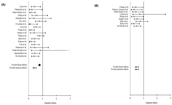(A) Forest plots of overall survival and (B) disease-free survival. Horizontal axis represents Hazard Ratios.