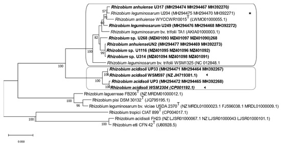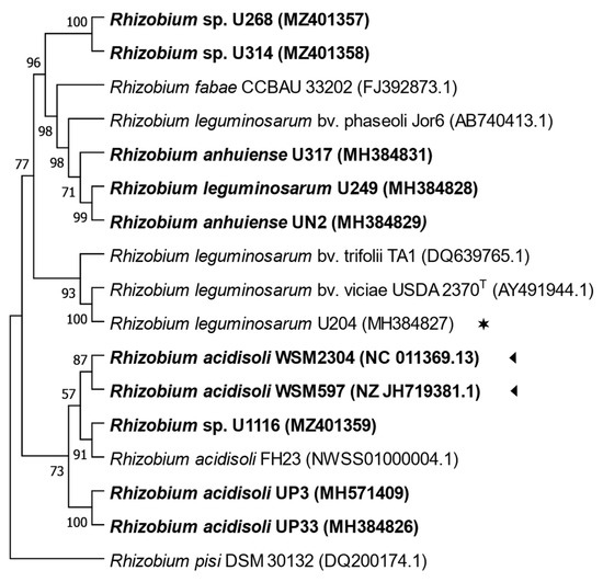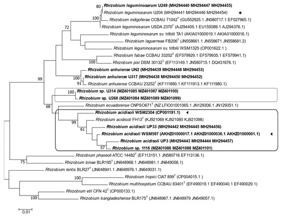 GenBank accession numbers for partial nucleotide sequences from strains U1116, U268, and U314 are MZ393150, MZ393151, and MZ393152 for rRNA 16S gene; MZ401359, MZ401357, and MZ401358, for the ITS region; MZ401104, MZ401102, and MZ401103 for the rpoB gene; or MZ401101, MZ401099, and MZ401100 for the recA gene; MZ401088, MZ401089, and MZ401087 for the glnII gene; or MZ401086, MZ401084, and MZ401085 for the atpD gene; MZ401095, MZ401093, and MZ401094 for nodA; MZ401096, MZ401097, and MZ401098 for nodC; and MZ401092, MZ401090, and MZ401091 for the nifH gene, respectively.