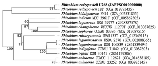 Since U268 was separated from other species in the phylogenetic analysis of ITS and housekeeping genes (Figure 2 and Figure 3), we obtained its genome sequence as well. The U268 draft genome revealed that it is 6.87 Mb in size. With 61.2% GC content, it contains 6998 coding sequences and 48 RNA genes. Based on TCS, several Rhizobium spp., including R. chutanense, R. leguminosarum bv. trifolii, R. hidalgonense, R. ecuadorense, R. redzepovicii, and R. acidisoli, were found to be related with the U268 strain considering z-scores > 0.999; however, based on the tetra-nucleotide signature, only R. redzepovicii and R. acidisoli showed z-scores > 0.999. Further, we found ANIb and ANIm values ≥ 96% only when comparing the U268 genome with R. redzepovicii, which consistently identified U268 as R. redzepovicii. The phylogenetic analysis of R. redzepovicii U268, R. redzepovicii 18T, and other Rhizobium spp. strains showed that the 18T and U268 strains genomes cluster together (Figure 5), and according to TYGS analysis, the U268 strain is an R. redzepovicii.