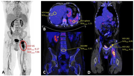 (A) Maximum intensity projection (MIP) of a patient with a proven femoral vascular graft infection (grade 3, heterogeneous uptake) with multiple lymph nodes on the suspected external and common iliac lymphatic drainage pathway. (B) SUVmean measurements in the liver and the spleen. (C) Bone marrow SUVmean measurement in the lumbar spine (L5). (D) SUVmax measurements in the lymph nodes. Abbreviations: VOI = volume of interest, VG = vascular graft, BM = bone marrow, LN = lymph node.