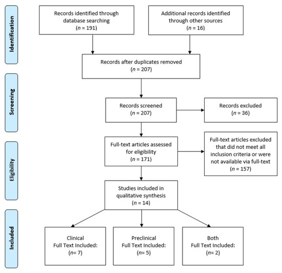 Three authors (R.S., J.Z., and H.R.) screened the abstracts, reviewed the references of eligible manuscripts, and performed full review and data extraction on selected studies. Extracted data included the study classification (preclinical or clinical), study design (retrospective, prospective, animal, and cell culture), mode of alcohol documentation, preclinical model of ethanol administration, risks associated with alcohol use patterns (heavy, light, or binge drinking), outcomes (risk of CRC mortality or CRLM due to alcohol), and potential mechanisms involved in alcohol-related CRLM. The search and study selection process resulted in the identification of total of 207 studies for abstract review with a total of 14 full-text articles satisfying the criteria for qualitative full manuscript evaluation. Figure 1 is the PRISMA flow chart showing the mapping review selection of manuscripts reporting the association of alcohol in colorectal cancer outcomes including liver metastasis.