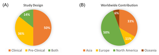Study design and origin of contribution. (A) The percentage of studies according to the design (human subject data, pre-clinical, or a combination of both); (B) The distribution of studies according to the continent of origin.