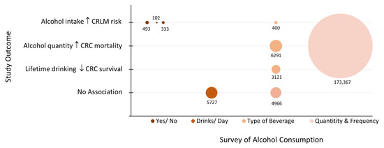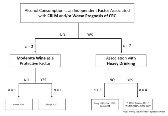 In summary, the current review of studies evaluating the relationship of alcohol consumption and the development of CRLM is timely and of clinical significance. The association of prevalent drinking habits with CRC outcomes is not fully understood and as reported here, is clearly understudied. The relevance of research in this area has been highlighted by recent reports concerning the potential impact of unprecedented drinking habits noted since the beginning of the COVID-19 pandemic. During the height of the shutdown period alone (March 2020 to September 2020), a 20% increase in alcohol sales was accompanied by excessive drinking patterns [6,38]. Unfortunately, the continued increase in alcohol consumption rates is expected to translate into significant health consequences in years to come with thousands of additional deaths estimated by 2040 that are due to alcohol-related liver disease and cancer [7]. It is difficult to assess what the unintended health consequences associated with alcohol consumption will be for patients that are/or will be diagnosed with CRC, but the need for continued and more extensive research is evident.