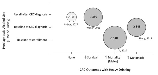 Bubble plot of studies reporting the type of alcohol beverage consumed by prediagnostic timeline and outcomes associated with heavy drinking. Bubble size reflects the noted quantity of alcohol (grams/week) that was designated as heavy drinking in each study [12,16,19,22]. CRC: colorectal cancer.