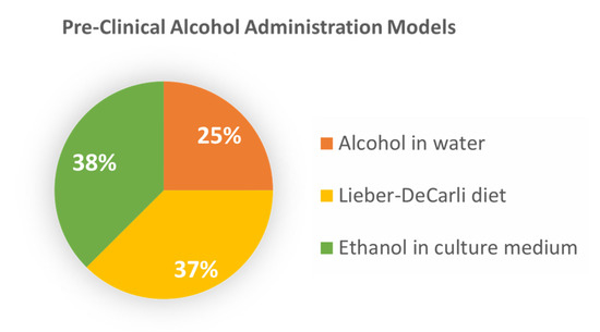 Alcohol exposure models used in preclinical studies. The percentage of studies is noted for the in vivo assessment of colorectal liver metastasis in animals fed alcohol in water or in Lieber–DeCarli diet; and colorectal cancer cell cultures treated in vitro with various concentrations of ethanol.