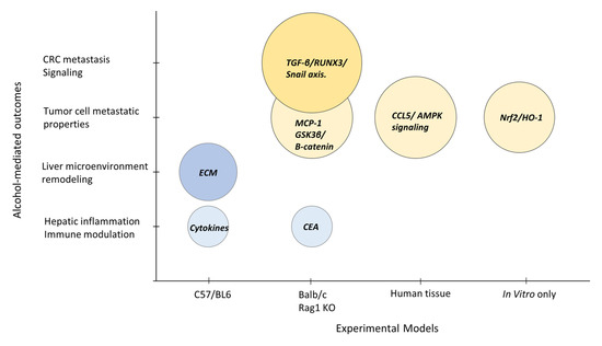 Summary of preclinical study results. Bubble plot reporting the study outcomes influenced by alcohol treatment in models using immunocompetent mice (C57/BL6) or immunodeficient mouse strains (Balb/c, Rag1 KO mice); human biopsy tissue; or in vitro only cell culture studies. The prometastatic pathways identified are highlighted for the alcohol-affected liver microenvironment (blue bubbles) or CRC tumor cell behavior (yellow bubbles). The bubble size reflects the number of tumor cells assessed in each study. CCL5: C-C chemokine ligand 5; CEA: carcinoembryonic antigen; CRC: colorectal cancer; ECM: extracellular matrix; MCP-1: monocyte chemoattractant protein-1.