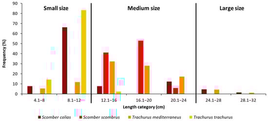 Length frequency distributions of n = 62 individuals of Scomber colias, n = 16 individuals of Scomber scombrus; n = 93 individuals of Trachurus mediterraneus and n = 42 individuals of Trachurus trachurus captured during summer in the Adriatic Sea. Specimens were divided into three size classes according to their length: small (<12 cm TL), medium (from 12.1 to 24 cm TL) and large (≥24 cm TL) size.