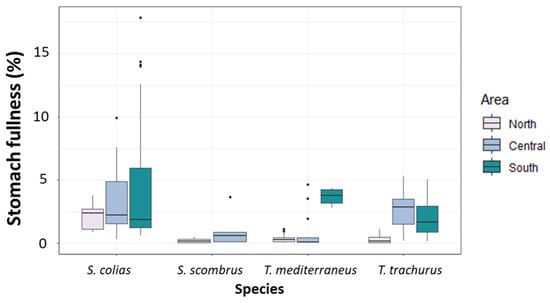 Boxplot of stomach fullness (%) measured in the specimens of the four “ancillary” species captured in the North, Central and South Adriatic Sea.