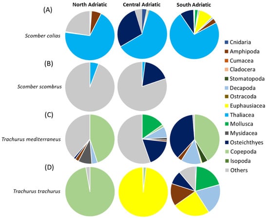 Composition expressed as %IRI of the diets of (A) Scomber colias, (B) Scomber scombrus, (C) Trachurus mediterraneus and (D) Trachurus trachurus in the North, Central and South Adriatic Sea. The category of “other material” includes undigested material, fish scales and parasites.