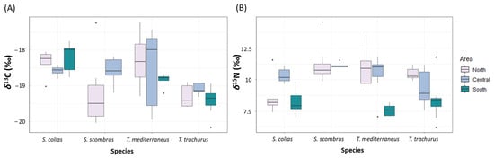Boxplot showing the values of (A) δ13C (‰) and (B) δ15N (‰) measured in the four “ancillary” species captured in the North, Central and South Adriatic Sea.