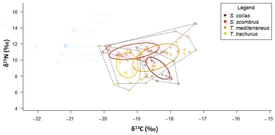 Considering all the four species together, T. mediterraneus displayed the widest SEAC, while S. colias displayed the narrowest one. The latter species also displayed the lowest mean value of trophic diversity, but these results should be carefully considered, since few specimens of Atlantic chub mackerel and predominantly juvenile were taken for this study.