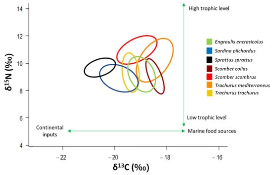 The four pelagic “ancillary” species studied here showed a trophic position located in the middle of the food web, near other small pelagic species such as Engraulis encrasicolus, Sprattus sprattus and Sardina pilchardus []. Scomber scombrus and T. mediterraneus occupy a slightly higher trophic position than the other small pelagics (Figure 7). The trophic position of these four “ancillary” species confirms their role of pelagic mesopredators that have a trophic niche positioned in the middle of the trophic web [].