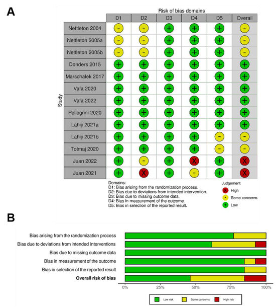Two of the thirteen included studies [52,53] were identified as having overall high ROB, five studies [41,42,43,48,51] were interpreted as having some concerns (particularly in either ROB domains 1 and 2 or domain 5), and six studies [44,45,46,47,49,50] were identified with a low ROB for all domains (Figure 2A). The overall summary of risk of bias (ROB) of the thirteen included studies appears in Figure 2B.