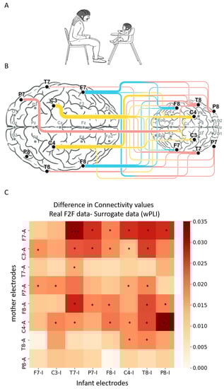 Difference in connectivity values for all electrode combinations between the real face-to-face data and the surrogate data. (A) Infant–mother paradigm. Infant and mother were fitted with EEG electrodes and participated in a face-to-face (F2F) free interaction paradigm. (B) Illustration of infant–mother inter-brain neural synchrony. Electrodes recorded and analyzed are marked in bold dots; inter-brain neural synchrony values were calculated for theta frequency band (4 to 7 Hz) using weighted phase lag index (wPLI). Connectivity scores were computed for all inter-subject electrode combinations, resulting in 64 wPLI values per dyad. The lines between mother’s (left) and infant’s (right) electrodes reflect the significant inter-brain connections compared with surrogate data. The width of the lines reflects the number of significant connections each electrode is involved with. (C) The x axis represents the infant electrodes, and the y axis the mother electrodes. The color legend represents the difference between the real and the surrogate connectivity scores, such that dark red–colored squares represent comparisons with higher connectivity in the real F2F condition compared with the surrogate data. Nonparametric Mann–Whitney test followed by FDR correction for multiple comparisons revealed real significant neural connectivity during infant–mother face-to-face interaction. The significant comparisons following correction are marked with asterisks.