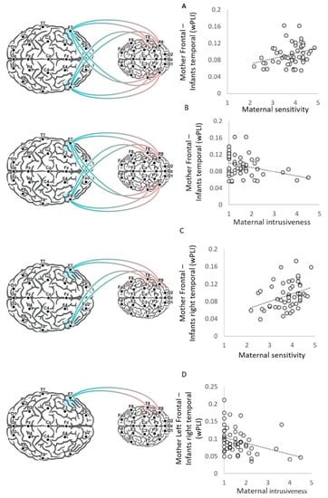 Identification of the various inter-brain connections during mother–infant face-to-face interaction reveals that all possible combinations between maternal frontal (both right and left hemisphere) and infant’s temporal (both right and left hemisphere) are significant. The connectivity between mother-frontal and infant-temporal regions has been previously shown in hyperscanning studies of parent–child interaction as prevalent and linked to behavioral measures [41,42,44,45], and therefore, we tested Spearman correlation between the mother-frontal–infant-temporal neural synchrony scores with maternal sensitivity and intrusiveness.