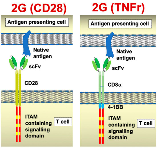 Chimeric antigen receptor structure. Cartoons illustrate the structures of a CD28 and a tumour necrosis factor receptor (TNFr)-containing second-generation CARs. Most commonly, 4-1BB is incorporated into the latter CAR platform.