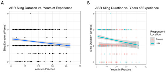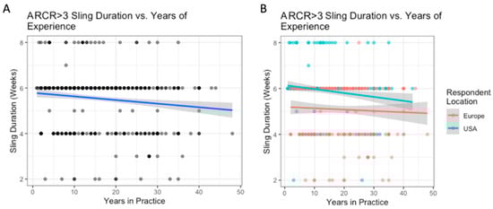 Variation in use of sling based on surgeon location is outlined in Table 9. Surgeons based in the US reported higher abduction pillow sling use than Europeans (57% vs. 18%, p < 0.001), while Europeans reported higher simple sling use than Americans (73% vs. 39%, p < 0.001) (Table 9). For each additional decade of experience, the average sling duration in weeks decreased by 0.19 weeks (p = 0.022) (Figure 8A). Experience did not influence sling duration differently for US and European surgeons (Figure 7B). On average, respondents from the US reported 1 week longer sling durations than Europeans (mean 4.0 vs. 3.6 weeks, p = 0.031). There were no significant differences between regions within the US and Europe.