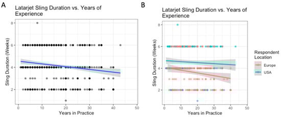 Latarjet procedure: the relationship between years of experience and sling duration (A); with breakdown by location (B).