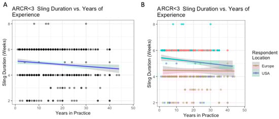 ARCR (tears > 3 cm): the relationship between years of experience and sling duration (A); with breakdown by location (B).