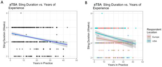 ATSA: the relationship between years of experience and sling duration (A); with breakdown by location (B).