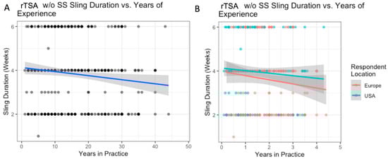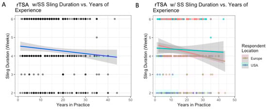 rTSA without subscapularis repair: the relationship between years of experience and sling duration (A); with breakdown by location (B).