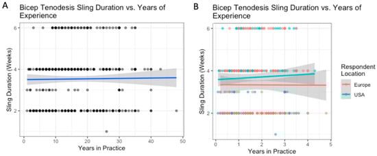 Isolated biceps tenodesis: the relationship between years of experience and sling duration (A); with breakdown by location (B).