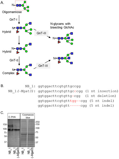 Engineering the knockout of the Mgat3 gene in the NB_1 cell line. Depiction of the N-glycan processing pathway, in which simple, oligomannose, N-glycans are processed into mature hybrid and complex N-glycans. Dashed box denotes the common core sequence of N-glycans. Oligomannose N-glycans are converted into hybrid via GnT-I, and hybrid N-glycans are converted into complex type through GnT-II activity. GnT-III inserts a bisecting GlcNAc residue on either hybrid or complex, halting further branching of the N-glycan structure (A). The coding sequence of rat Mgat3 from 284 to 304 was compared to that of a newly created NB_1(-Mgat3) cell line (B). Red hyphens indicate deleted nucleotides. E-PHA lectin blot and Coomassie blue-stained gel of whole cell lysates from NB_1 and NB_1(-Mgat3) (C). Number adjacent to the blot and gel denote protein markers (in KDa). Full lectin blot and Coomassie blue-stained gel (Figure S1).