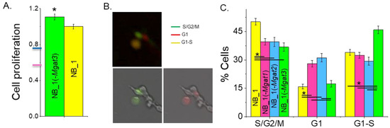 To ascertain whether the different proliferation rates of the N-glycosylation mutant and parental cell lines correlated with changes in cell cycle progression, we performed fluorescent microscopy analysis of these cell lines. Unsynchronized cells were labeled with CDT1-RFP and geminin-GFP, and then micrographs were obtained after 24 h. The percentage of cells in S/G2/M phases (Green), G1 phase (red) and G1-S transition (yellow) of the cell cycle were determined by the expression of geminin-GFP, CDT1-RFP or both fluorescently labeled proteins, respectively, from each micrograph (Figure 2B). The NB_1 and NB_1(-Mgat3) cell lines had the largest percentage of cells in the S/G2/M phases and G1-S transition, respectively, while NB_1(-Mgat1) and NB_1(-Mgat2) had lower levels of cells in these proliferating states (Figure 2C). Moreover, NB_1(-Mgat1) and NB_1(-Mgat2) had more cells in the nonproliferating phase, the G1 phase. Therefore, a lowered expression of either GnT-I or GnT-II in NB_1 cells reduced the proliferation rate, and the reduction in cell proliferation was due to impeding the progression of cells through the G1 phase of the cell cycle.