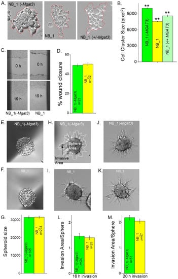 Influence of N-glycan populations on cell–cell adhesion, cell migration and cell invasion. Representative micrographs of resulting cell clusters from dissociated NB_1(-Mgat3) (left panel), NB_1 (middle panel) and NB_1(−/+Mgat3) (right panel) cell monolayers (A). Cell aggregates of more than 10 cells, as encircled in red, were analyzed. The average area of cell aggregates from NB_1(-Mgat3) (n = 775), NB_1 (n = 907) and NB_1(−/+MGAT3) (n = 775) (B). n represents a cell cluster. One-way ANOVA followed by Holmes–Bonferroni’s test was used to compare differences in mean values. A value of p < 0.01 was considered significant (**). Images of scratches in cell monolayers of NB_1 and NB_1 (-Mgat3) at 0 h and 19 h migration (C). The bar graph shows the mean percentage of wound closure at 19 h (D). Characteristic images of spheroids formed in culture at 4 days by NB_1(-Mgat3) (E) and NB_1 (F), and their mean spheroid sizes (G). Matrigel invasion was captured at 16 h (H,I) or 20 h (J,K). Encircled areas in white invasion area or sphere area, respectively (G). Bar graphs indicate spheroid invasiveness at 16 h (L) or 20 h (M). Data are shown as the mean ± SEM and were compared by Student’s t-test. n denotes number wounds, spheroids and invading spheroids.