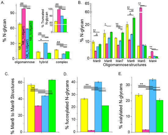 Relating oligomannose, fucosylated and sialylated N-glycans to changes in the N-glycosylation pathway of the various NB_1 cell lines. Summarization of the percent of various N-glycan types per cell line (A), large to small oligomannose N-glycans (B), 6–9 mannose residues (C), fucosylated N-glycans (D) and sialylated N-glycans (E) as identified by the ESI-MS spectra. The inset (A) shows the percentage of truncated N-glycans. Data are shown as the mean ± SEM, n = 2, and were compared by one-way ANOVA using Holm–Bonferroni post hoc test (* p < 0.1), (** p < 0.05).