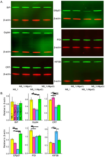 N-glycans and expression of ER chaperones in NB cells. Western blots of BiP (~78 KDa), Grp94 (~94 KDa), CRT (~55 KDa), PDI (~57 KDa), ERp57 (~57 KDa) and KiF5B (110 KDa) multiplexed with β-actin:rhodamine (A). In all cases, immunobands of interest were normalized to β-actin for each sample load, and then means were calculated. Bar graphs reveal the level of BiP (n = 5), Grp94 (n = 4), CRT (n = 4), ERp57 (n = 4), PDI (n = 5) and KIF5B (n = 4) expression in NB_1, NB_1(-Mgat1), NB_1(-Mgat2) and NB_1(-Mgat3) cells (B). Data are presented as mean ± SEM and were all compared by one-way ANOVA with Holm–Bonferroni mean comparison (** p < 0.01, * p < 0.05). Full Western blots (Figure S1).