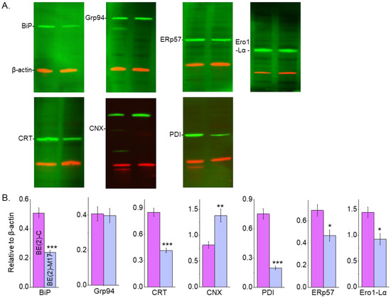 ER chaperones and N-glycan populations of human neuronal cells. Western blots of BiP (~78 KDa), Grp94 (~94 KDa), CRT (~55 KDa), CNX (~90 KDa), PDI (~57 KDa), ERp57 (~57 KDa) and Ero1-L alpha (~60 KDa) multiplexed with β-actin:rhodamine (A) and quantification of BiP (n = 5), Grp94 (n = 6), CRT (n = 11), CNX (n = 7), PDI (n = 6), ERp57 (n = 6) and Ero1-L alpha (n = 4) in BE(2)-C and BE(2)-M17 cells (B). In all cases, immunobands of interest were normalized to β-actin for each sample load, and then means were calculated. Data are presented as mean ± SEM and were all compared by Student’s t-test (*** p < 0.001, ** p < 0.05, * p < 0.1). Full Western blots (Figure S1).