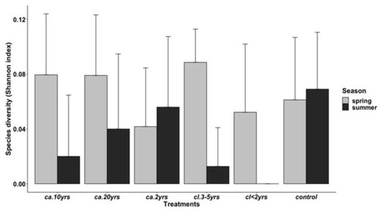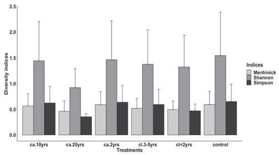 There were significant differences in species richness found for treatments: cl. 3–5 yrs, cl. < 2 yrs, ca. 2 yrs, and the control. However, no significant differences were found for treatments ca. 20 yrs (Table 5).