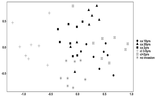 MDS plot (derived from Bray_Curtis dissimilarity in square root transformed data, Stress value = 0.148) showing large mammal assemblages of the six areas with differing L. camara invasion durations (ca), differing L. camara clearing (cl) times, and a control area with no L. camara invasion in Groenkloof Nature Reserve, South Africa.