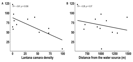For plots where large mammal tracks were sampled, regression indicated that the two independent variables (distance to the water source and L. camara density) explained 70.0% of the variance (R2 = 0.735, F2,15 = 20.89, p < 0.001). Distance of treatments from the water source was not a significant predictor of species richness (β = −0.07, p = 0.37; Figure 3), but the density of L. camara in the treatments was a significant predictor of species richness (β = −0.55, p = 0.036; Figure 3A). The relationship between the predictor variables, the density of L. camara inside the treatment plots, and the distance of treatments from the water source was not significant (t = 1.919; d = 16; p = 0.073). However, species richness was far higher in plots with very little L. camara (Figure 3A).